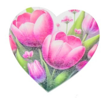 A 9,5 cm-es, kartonból készült, tulipán motívummal nyomtatott díszszív elegáns és romantikus elem, ideális virágdíszekhez, tavaszi dekorációkhoz, kézzel készített projektekhez és virágos témájú barkács alkotásokhoz. A készlet 2 darabot tartalmaz, tökéletes kiegyensúlyozott kompozíciókhoz.