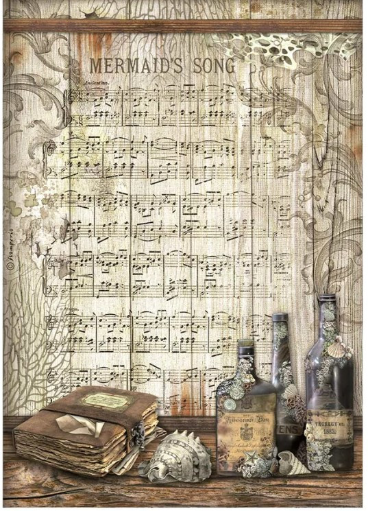 Ez a rizspapírlap titokzatos és romantikus bájt kölcsönöz a terméknek, melyet a tengeri történetek és az elveszett ősi kincsek esztétikája ihletett. A hátteret ősi kották alkotják, a hangjegyek egy olyan textúrára helyezkednek el, amely a régi fát utánozza, idő és hullámok jellemzik. A diszkrét, tengerész stílusú grafikai minták, stilizált hullámok és organikus elemek harmonikusan fonódnak össze a vintage tárgyakkal: kagylókkal és retró címkékkel díszített régi palackok, egy kopott napló, kagylók és tengerész elemek, amelyek tökéletesen kiegészítik a misztikum és a nosztalgia hangulatát. Ideális választás kreatív, tengeri témájú projektekhez, romantikus dekorációkhoz, shabby chic tárgyakhoz és történeteket elmesélő művészeti alkotásokhoz.