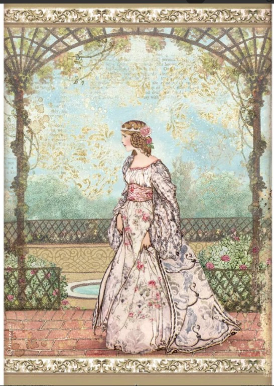 Ez a dekupázshoz használható rizspapír mesebeli hangulatot teremt, elegáns és kifinomult a projektjeidben. A kép egy fiatal nőt ábrázol vintage ruhában, tele virágos részletekkel, amint egy romantikus kertben sétál, amelyet eláraszt a fény, a zöld növényzet és a finom díszítőmotívumok. A pasztell háttér arany díszítésekkel, díszítőelemekkel és enyhén antikolt hatással klasszikus dizájnt teremt, amely tökéletes nőies, romantikus vagy shabby chic dekorációkhoz.