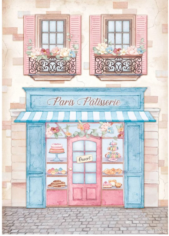 Ez a decoupage rizspapír Párizs édes illatát, a francia kávézók romantikus báját és a régi utcák bohém hangulatát idézi. Az illusztráció egy elegáns párizsi cukrászdát ábrázol, pasztell rózsaszín és kék árnyalatú homlokzattal, virágokkal díszített ablakokkal és tortákkal, macaronokkal, tortákkal és ellenállhatatlan finomságokkal teli vitrinekké. A vintage-shabby chic dizájn bármilyen kreatív projektet kifinomultság, nosztalgia és női szépség teli darabká varázsol.