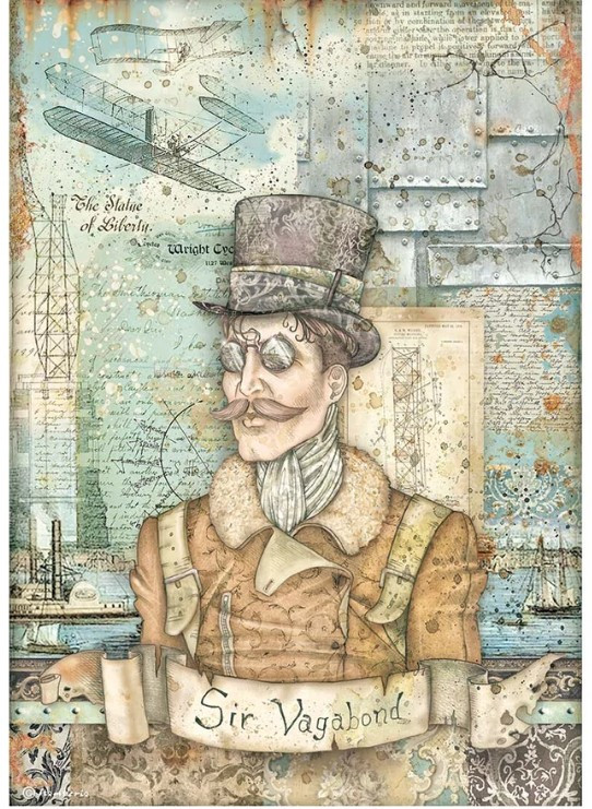 Ez a dekupázshoz való rizspapír a kalandok, a régi találmányok és a bátor felfedezők lenyűgöző világát mutatja be. A dizájn „Sir Vagabond” karakterét, egy steampunk stílusú úriember kalandort ábrázol, akit technikai vázlatok, repülési tervek, fém mechanizmusok és ipari elemek vesznek körül, mindezt patinás kék, bronz, krém és szépia árnyalatokban. A vintage hangulat egy régi történet érzetét kelti, tele misztikummal, kreativitással és felfedezésekkel.