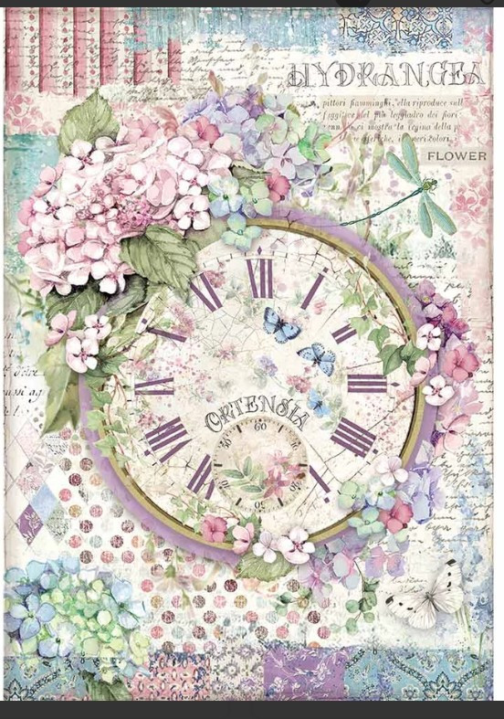 A4 rizspapír dekupázshoz – romantikus dizájn hortenziákkal, vintage órával és pasztell virágmotívumokkal