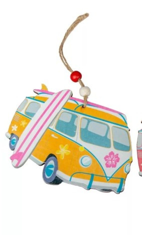 Dekoratív dekoráció szörfdeszkával ellátott autó formájában, akasztózsinórral felszerelve, hogy a vakáció és a nyár hangulatát bármilyen térbe elhozza. A színes dizájn és a retró stílus a tengerpart szabadságát és vidámságát idézi.