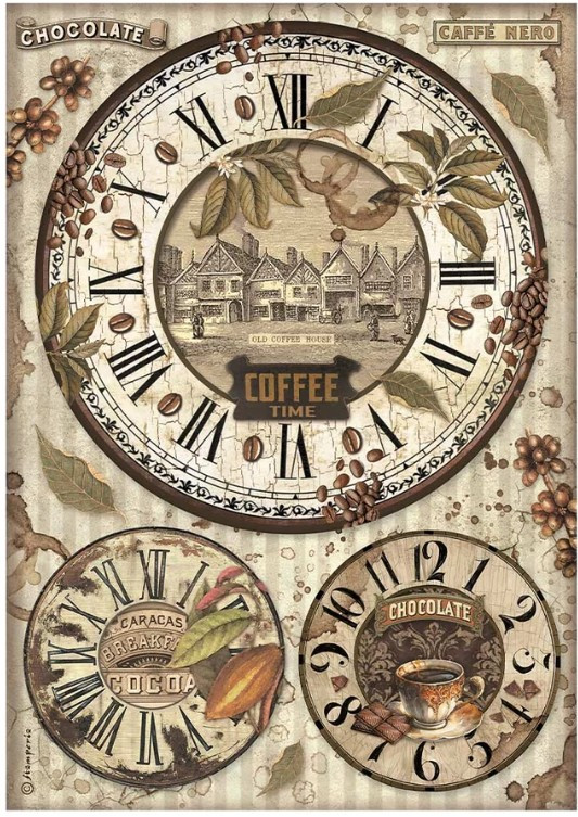 Ez az A4-es rizspapírlap kifejezetten a decoupage rajongóknak készült, akik szeretik a vintage stílust, a rusztikus díszítéseket és a régi európai kávézók meleg hangulatát. A dizájn számos dekoratív óralapból áll, amelyek finom részletekkel és természetes bézs, barna, krém és szépia árnyalatokkal vannak kidolgozva, a kávé és a csokoládé világából inspirálódott grafikai elemekkel kombinálva: kávébabok, szárított levelek, retró feliratok, forró csokoládé bögrék és klasszikus díszítő motívumok.