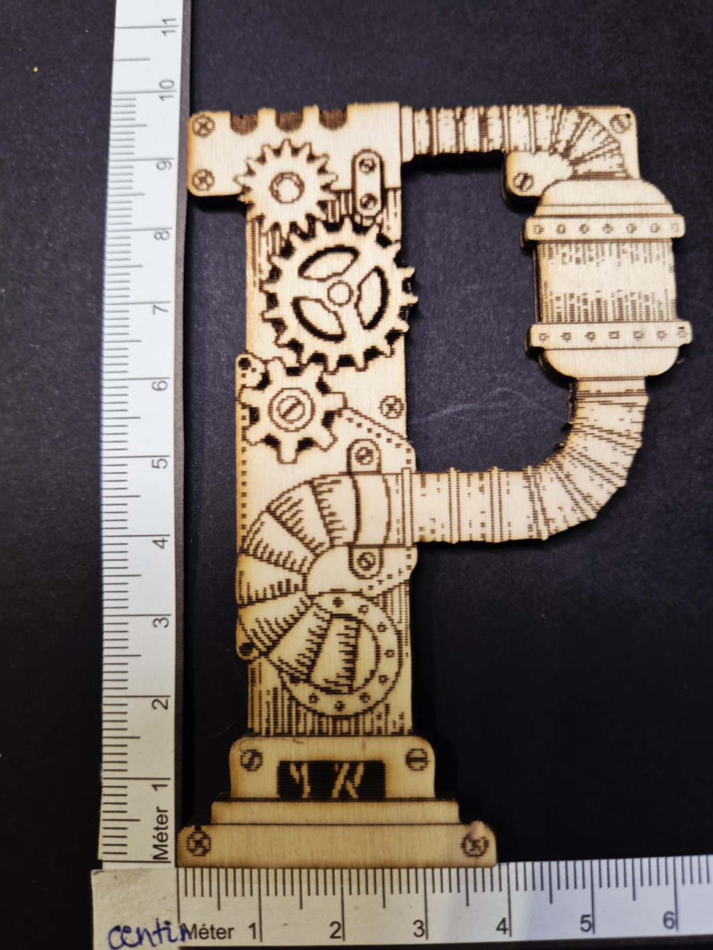 Dekoratív fa steampunk "P" betű – kb. 8,5 × 10 cm