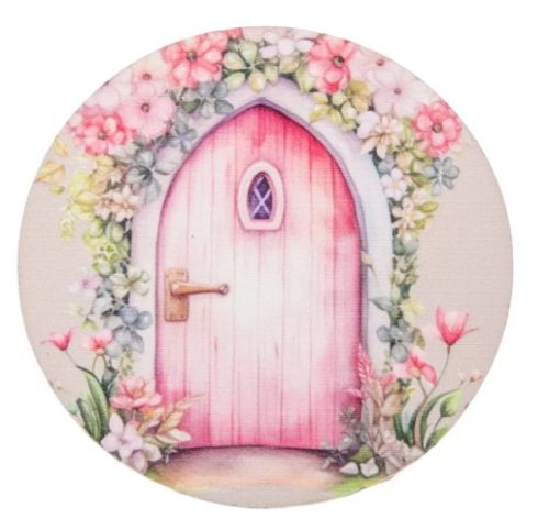 Dekoratív kerek tündérajtó figura, virágokkal és természeti elemekkel díszítve, UV nyomtatott kartonból készült, ideális egy varázslatos és titokzatos univerzum megteremtéséhez a gyerekek dekorációjában. A virágminta és a finom árnyalatok egy rejtett mesevilágba való belépést idéznek.