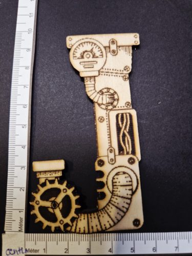 Dekoratív steampunk fa betű "J" – kb. 8,5 × 10 cm