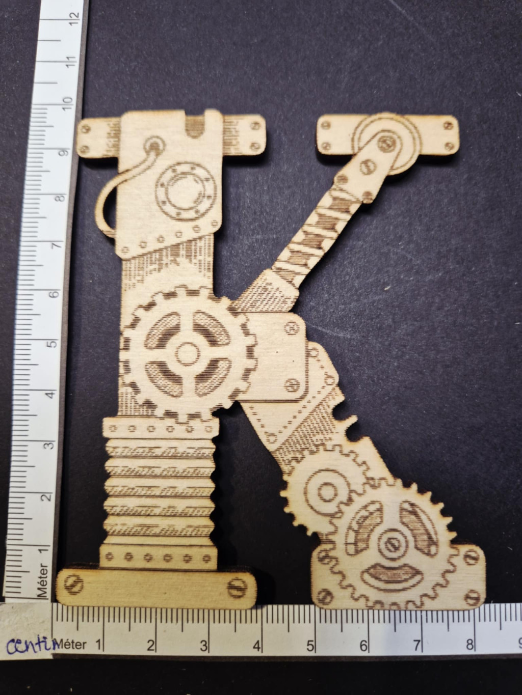 Dekoratív steampunk fa betű "K" – kb. 8,5 × 10 cm