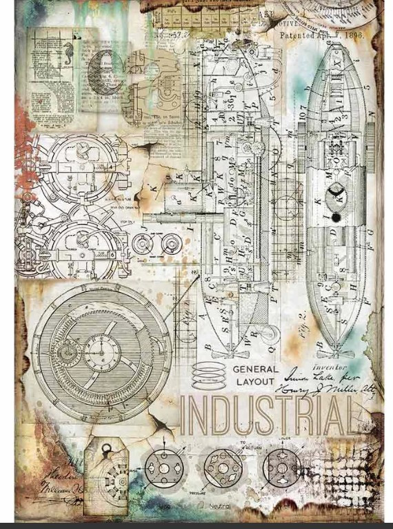 Dekupázs rizspapír A4 - Ipari, Vintage ipari formatervezés, mechanikai vázlatok és steampunk elemek