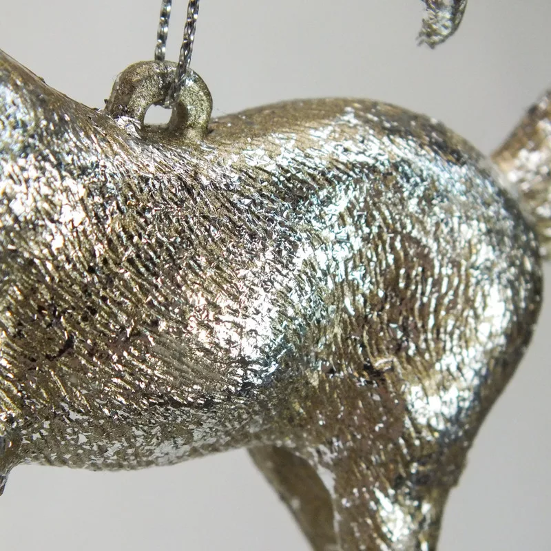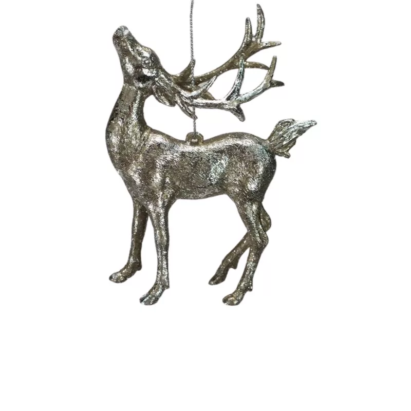 Akasztóval ellátott metálos felületű szarvas figura karácsonyi, szezonális és egyedi készítményekhez.