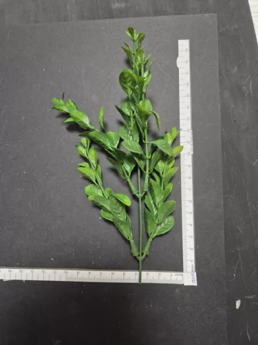 A műzöld ág elegáns virágdíszekhez készült. A levelek matt felületű, puha műanyagból készültek. A rugalmas szár könnyű hajlítást és beállítást tesz lehetővé. Vázákhoz, díszdobozokhoz és virágpanelekhez alkalmas. Idővel sem veszíti el alakját.