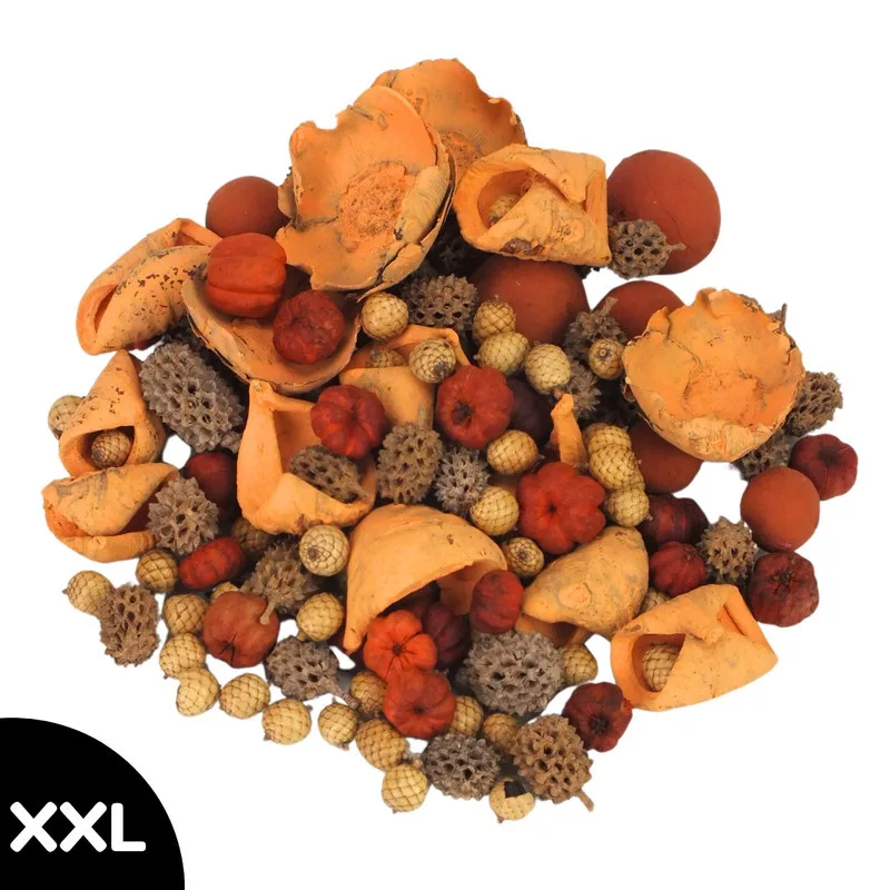 XXL terméscsomag a narancs és piros színek árnyalataiban, különböző igényes dekorációk elkészítéséhez és díszítéséhez. A kreatív terméscsomagok tökéletesek helykitöltésre és természetes dekorációkhoz. Ideálisak koszorúk, asztaldíszek és egyéb kreatív projektek készítéséhez.