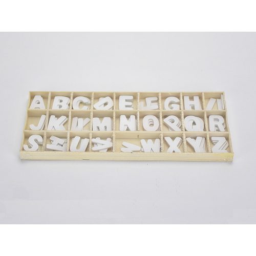 Fehér színű fa betűk dobozban. Minden betűből 3 darab található a dobozban.
