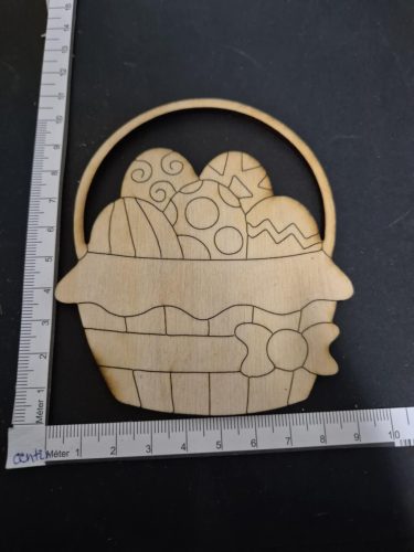 Fából készült húsvéti kosárfigura tojásokkal (11x8,5 cm).