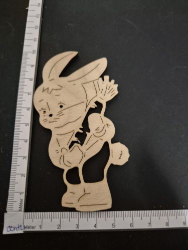 Fából készült nyuszi figura (10x6 cm). 3 mm-es natúr rétegelt lemezből készült, ideális húsvéti dekorációnak, asztaldísznek. Akrilfestékkel vagy temperával színezhető.