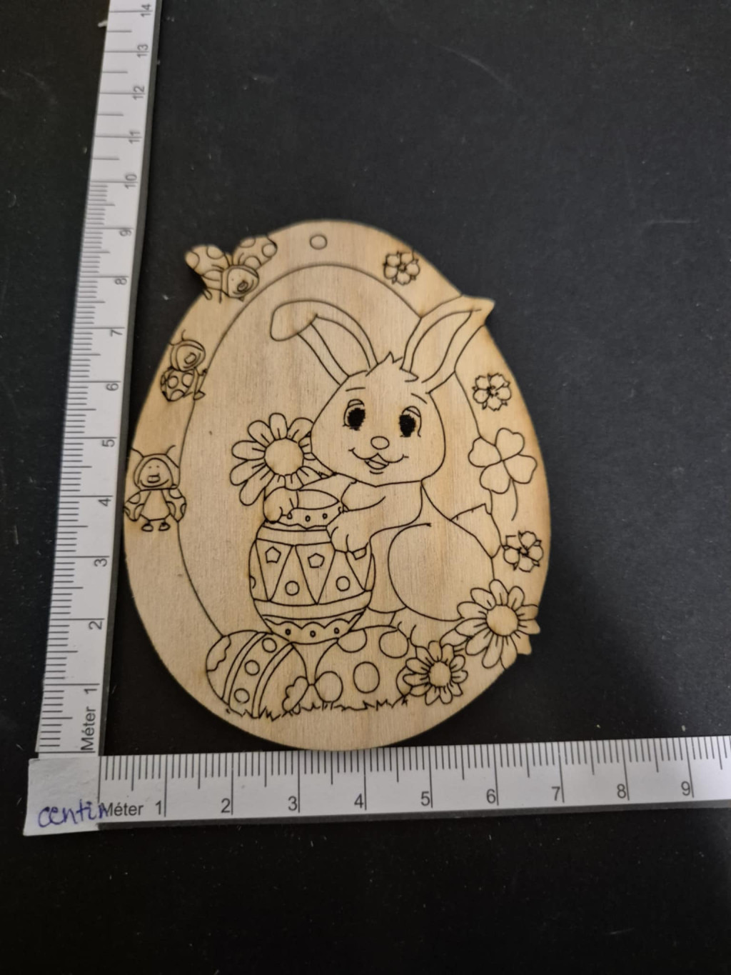 Fából készült nyuszifigura tojásokkal (9x6 cm). 3 mm-es natúr rétegelt lemezből készült, ideális húsvéti dekorációnak, asztaldísznek. Akrilfestékkel vagy temperával színezhető.