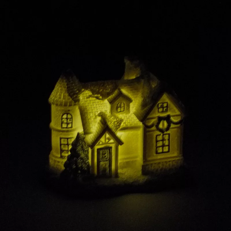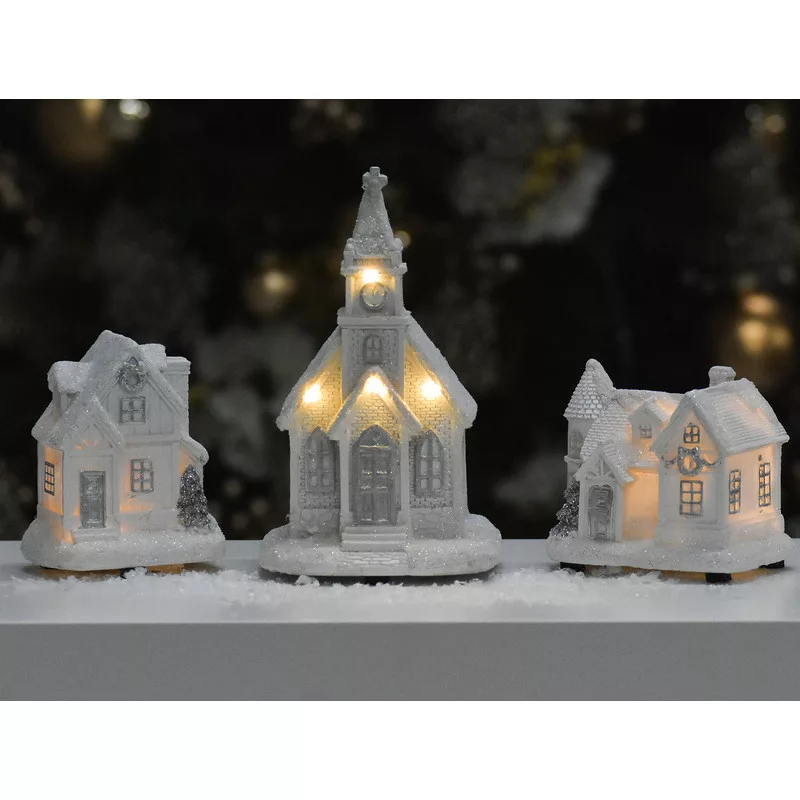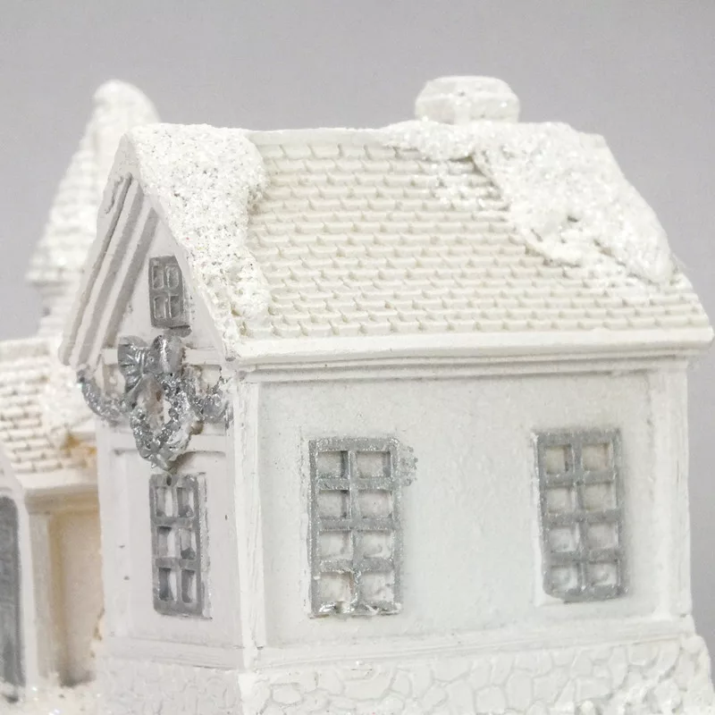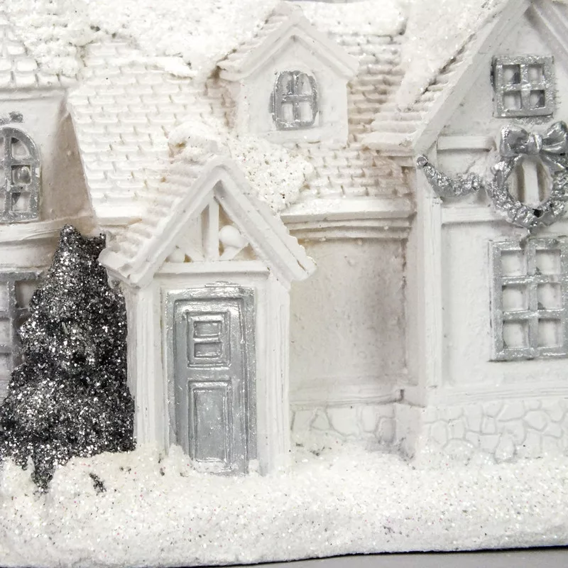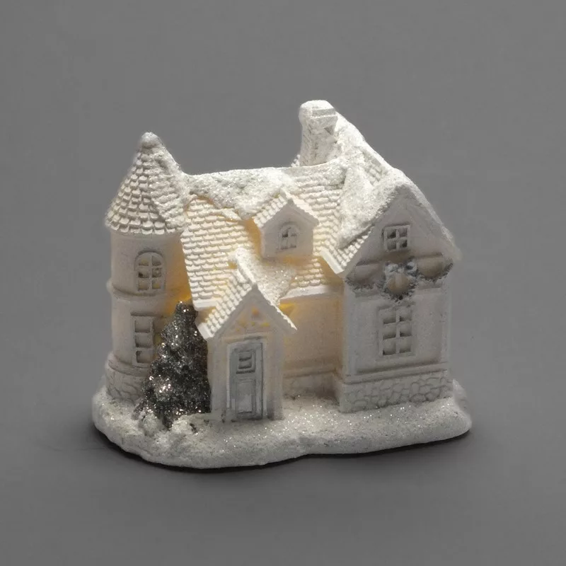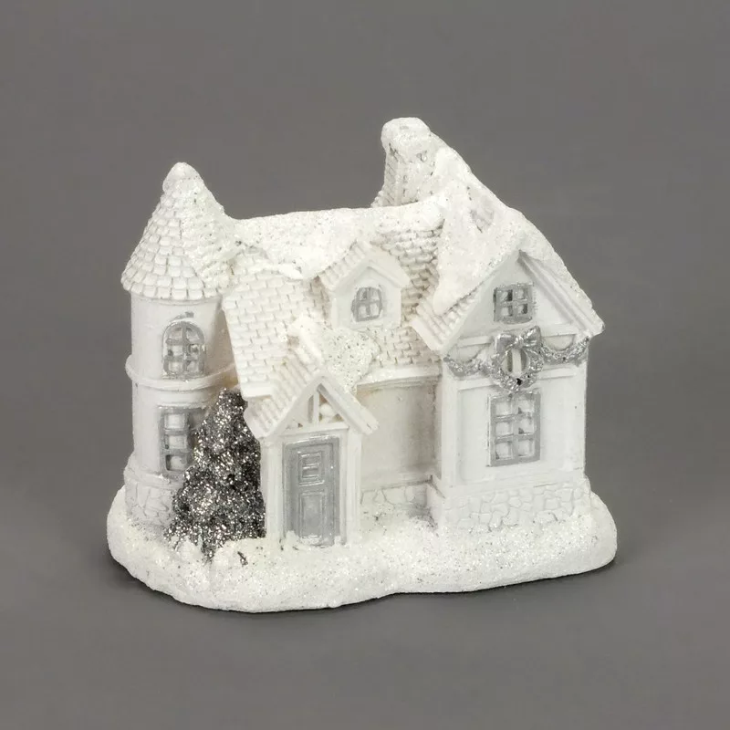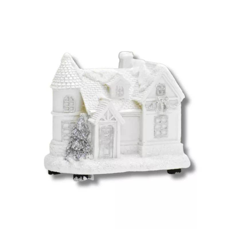 Fehér színű világítós ház, ezüstös díszítéssel, és fenyőfával. Csúszásgátló korongokkal ellátva. Használható önmagában otthoni dekorként vagy egyedi karácsonyi készítményekbe.