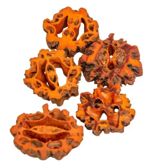 Ez az intenzív narancssárga árnyalatra festett fekete dió szelet természetes díszítőelem, ideális virágdíszekhez, belső dekorációkhoz és kreatív kézműves projektekhez. Organikus textúrája, szabálytalan formáival és természetes részleteivel hiteles és erőteljes vizuális megjelenést kölcsönöz.