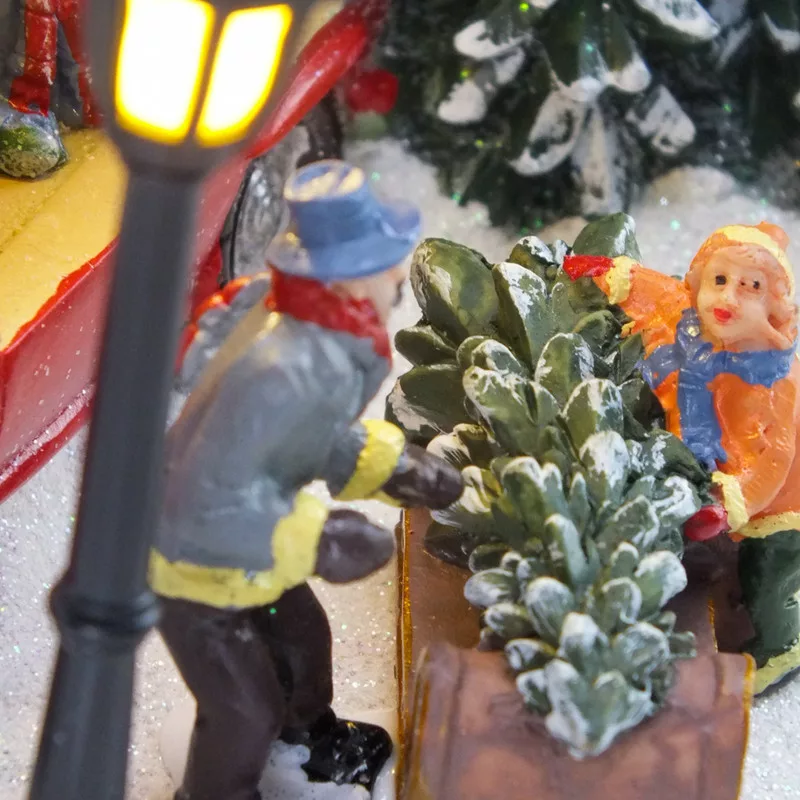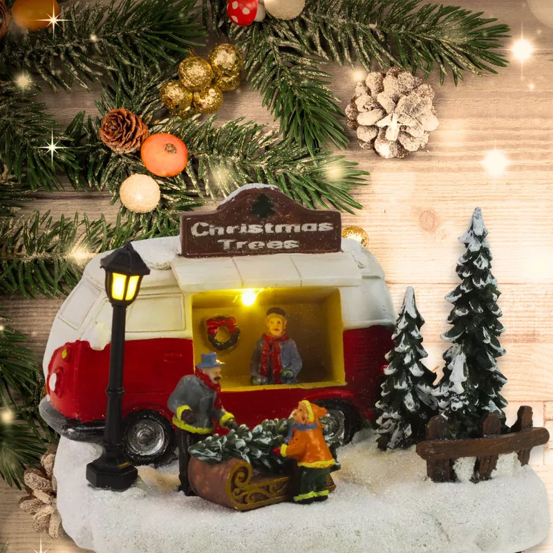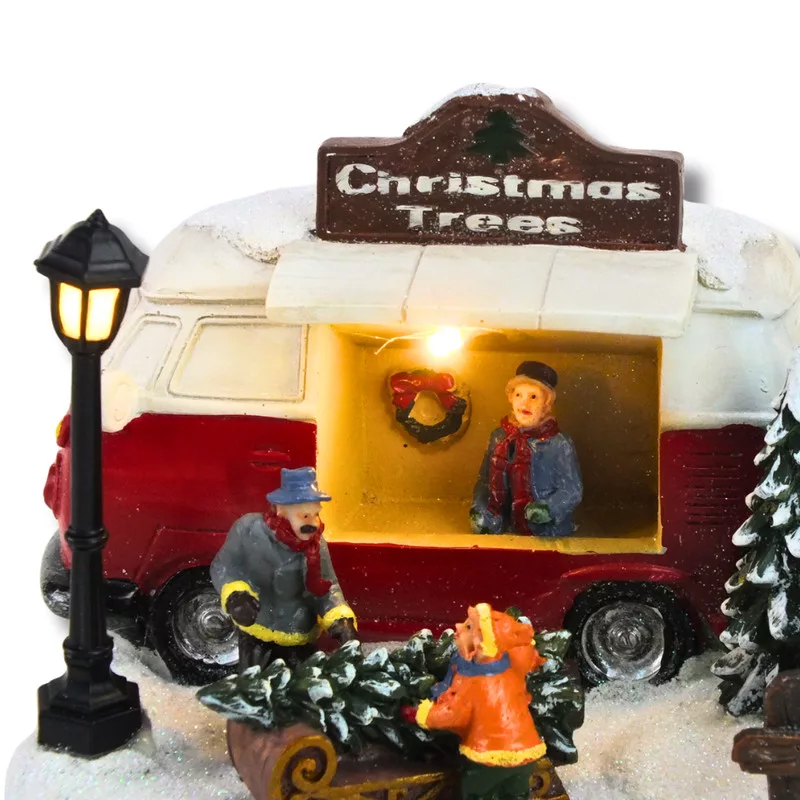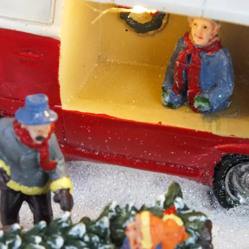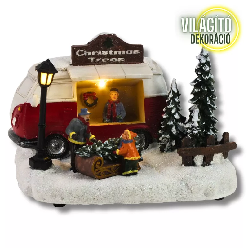 Hozd el otthonodba az igazi ünnepi hangulatot ezzel a bájos, retró stílusú karácsonyi jelenettel. A jelenet központi eleme egy karácsonyfát árusító kisbusz, előtte kis figurák, havas táj és fenyők. A meleg LED fény kiemeli a részleteket, így tökéletes dekoráció az ünnepi asztalra vagy polcra.