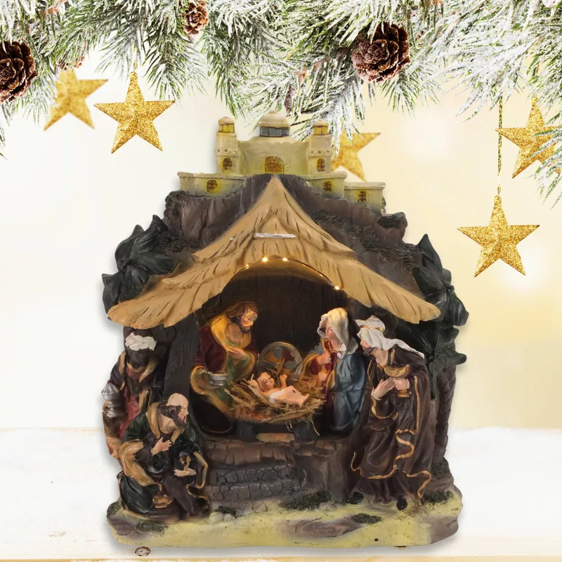 Hozd el otthonodba a karácsony varázsát ezzel a gyönyörű asztali betlehemmel!  Aprólékosan kidolgozott figurák és a hangulatos LED fény együtt teremtik meg a meghitt, ünnepi hangulatot. A betlehem minden részlete a hagyományos születésjelenetet idézi meg, így nemcsak dísz, hanem igazi karácsonyi élmény is. A meleg fény finoman kiemeli a figurákat, és különleges légkört varázsol az otthonodba.