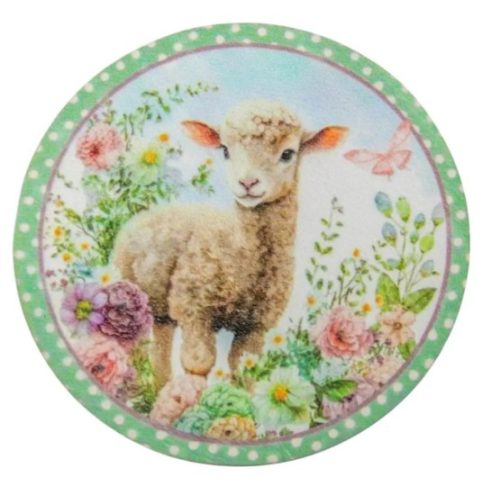 Kerek díszfigura húsvéti bárány a mezőn – UV nyomtatott karton, 11,8 cm