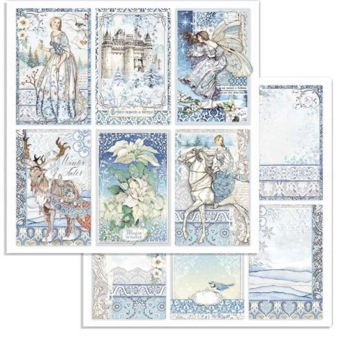 Ez a kiváló minőségű kétoldalas scrapbook papír a tél varázsából és a mesék varázsából ihletődött. A dizájn elegáns illusztrációkat tartalmaz hűvös kék, fehér és pasztell árnyalatokban, mesefigurákkal, havas várakkal, fantasy elemekkel, téli virágokkal és részletgazdag díszkeretekkel. A lap mindkét oldala művészi kompozíciókat kínál, amelyek egyenként kivághatók vagy teljes háttérként is használhatók, lehetővé téve a rendkívül kreatív és kifinomult projekteket. A finom textúrák, a vintage díszítések és az illusztrált elemek romantikus, finom és buja megjelenést kölcsönöznek minden, ezzel a papírral készült projektnek.