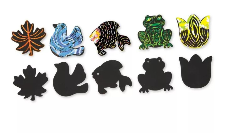 Egyszerűen használható, lenyűgöző látványt és sok-sok meglepetést nyújt minden egyes karcolással ez a Természet Képkarc Füzet, amivel egyedi módon küldhetsz üzeneteket, készíthetsz mintákat és ajándékokra címkéket. Kapard le a fekete bevonatot, és fedj fel 5 különböző, színes mintát. Minden egyes doboz 125 karclapot (körülbelül 9x9 cm) tartalmaz 5 természet témájú formában (virág, madár, levél, béka, és hal). A négyéves és idősebb gyerekek a fa karcceruza segítségével mintákat, firkákat, szavakat, képeket és egyebeket készíthetnek, hogy valóban egyedi műalkotásokat hozzanak létre. A karclapok és a ceruza egy praktikus kis asztali írószeres dobozban tárolható.