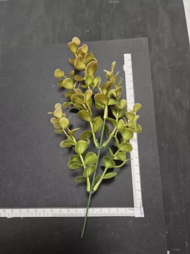 Ez a mesterséges díszág otthoni dekorációhoz és virágdíszek készítéséhez készült. A levelek rugalmas műanyagból készültek, kellemes textúrájúak és természetes színűek. A szár fém maggal rendelkezik, könnyen formázható. Vázákhoz, koszorúkhoz és kreatív projektekhez alkalmas. Nem igényel karbantartást és sokáig megőrzi alakját.