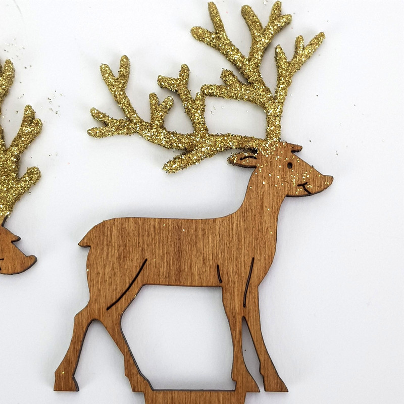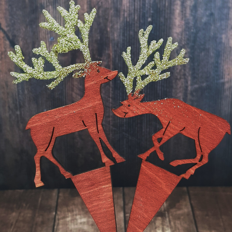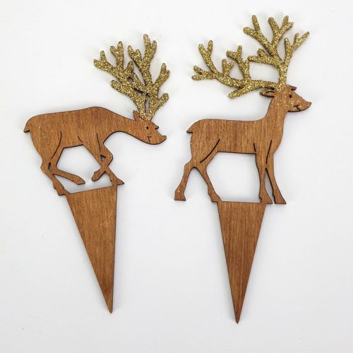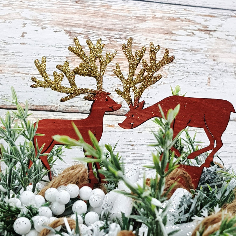 Natúr fából készített, barnára festett szarvasok, arany színű csillámos szarvakkal. A beszúrós talp megkönnyíti a dekorációba való beillesztést és segít megúszni a ragasztással járó nehézségeket. Így utólag is megváltoztathatjuk a szarvasok helyét a készítményben. Fantasztikus karácsonyi dekoráció, ami nem köszön vissza minden üzletben vagy otthoni dekorációban.