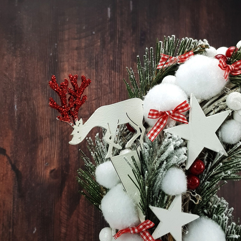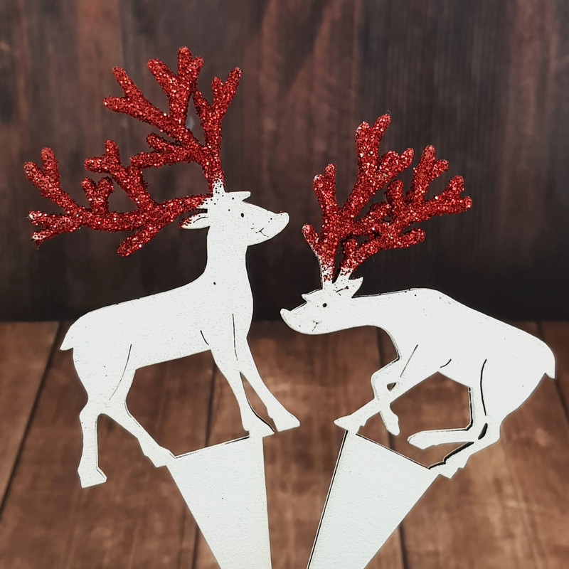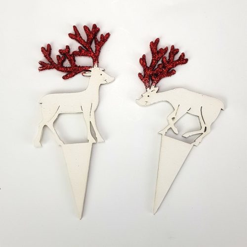 Natúr fából készített, fehérre festett szarvasok, piros színű csillámos szarvakkal. A beszúrós talp megkönnyíti a dekorációba való beillesztést és segít megúszni a ragasztással járó nehézségeket. Így utólag is megváltoztathatjuk a szarvasok helyét a készítményben. Fantasztikus karácsonyi dekoráció, ami nem köszön vissza minden üzletben vagy otthoni dekorációban.
