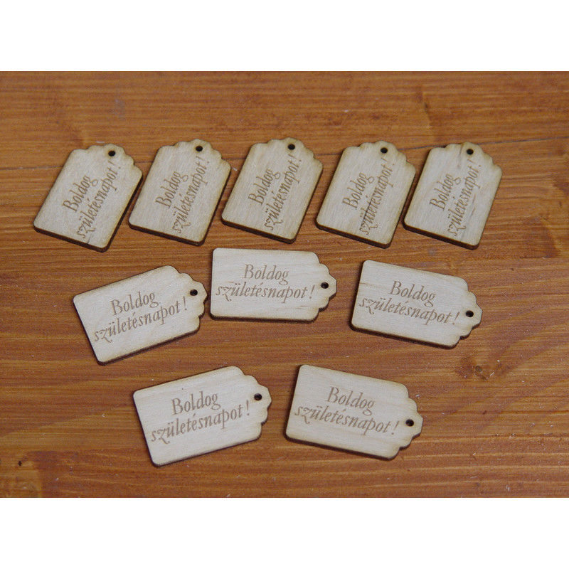 Natúr fa - "Boldog Születésnapot" gravírozott scrapbook táblák 3x4,5cm 10db/csomag