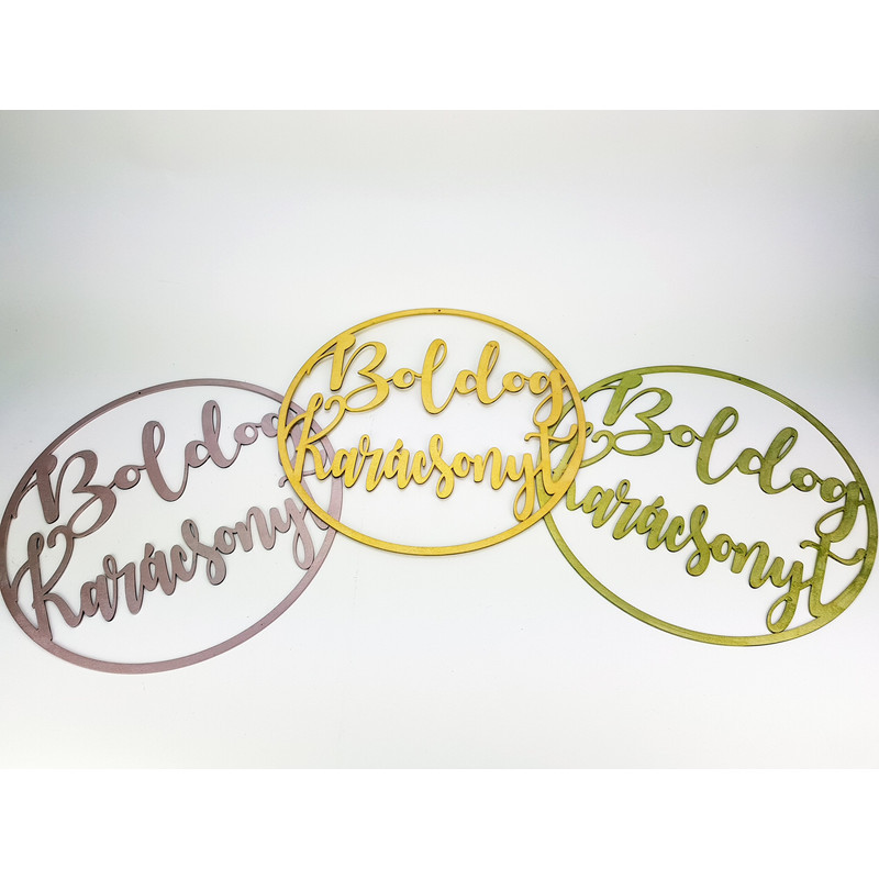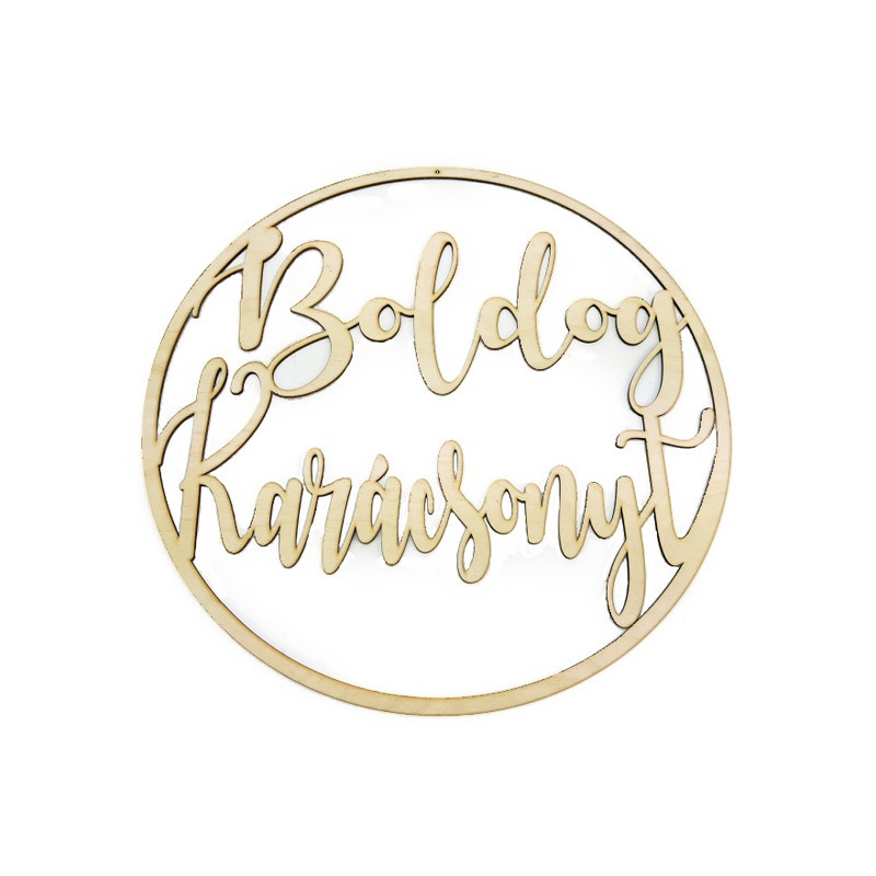 Lézervágott óriás natúr karika dekoráció, "Boldog Karácsonyt" felirattal. Önmagában is mutatós, de többféle kiegészítővel egyszerűen feldobhatjuk: masnival, szalagokkal, mini figurákkal és tobozzal, karácsonyi termésekkel stb. Használható ajtódísznek, otthoni beltéri dekorációként, ablakba vagy kirakatokba.