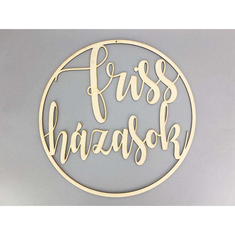 Friss Házasok" feliratos natúr fa karika, festhető, ragasztható felület.