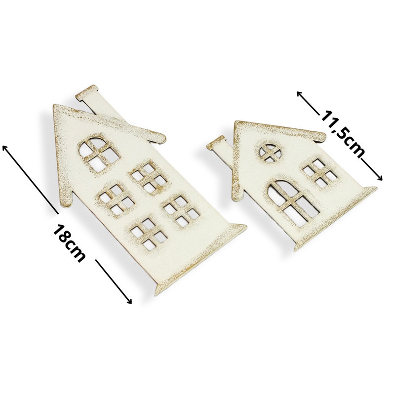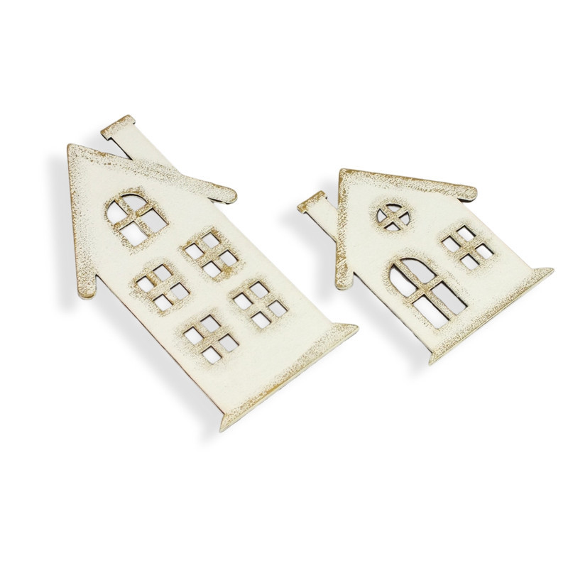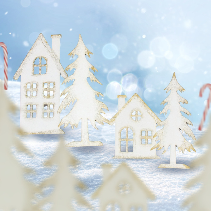 Natúr fából lézervágott házikó formák, fehérre festve és arany színnel díszítve. Jól mutat egyedi karácsonyi készítményekben, otthoni dekorációkban és üzletek bemutatóiban, kirakatokban.