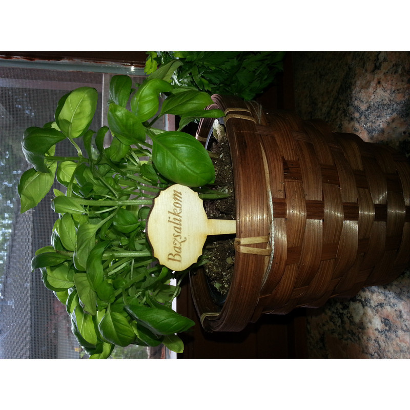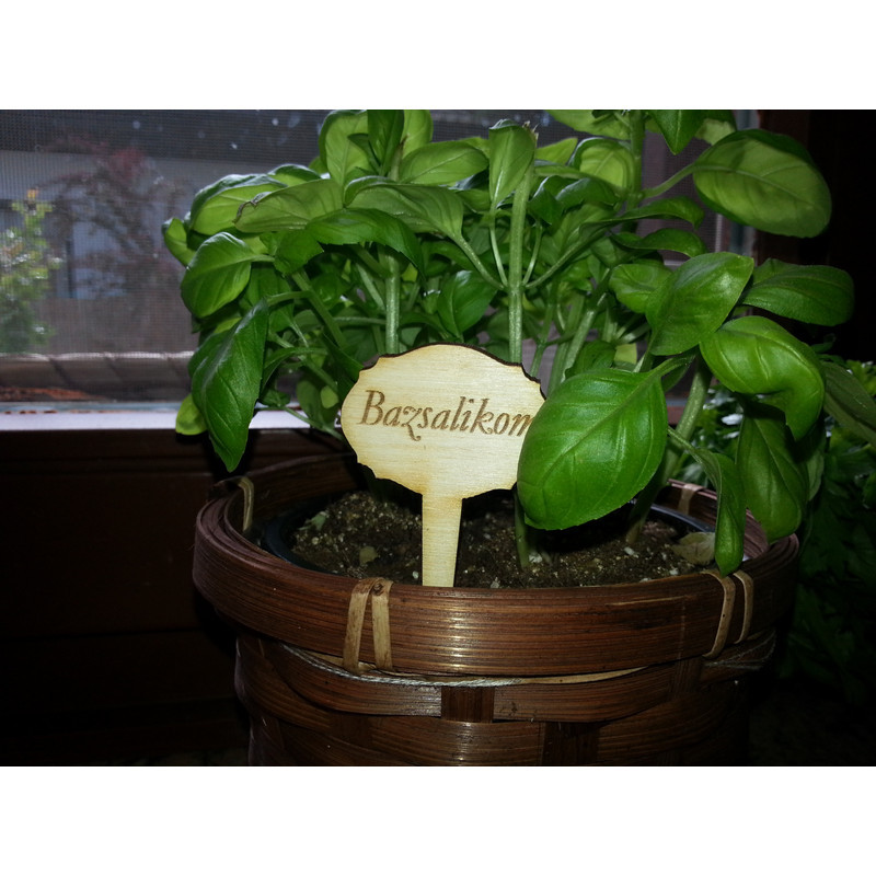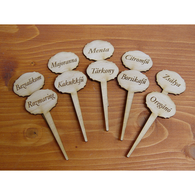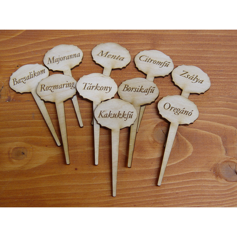 10 db fa,beszúrható táblácska, mindegyik különböző nevű fűszerrekkel Gravírozott felirat:bazsalikom,citromfű,menta,borsikafű,majoranna,zsálya,rozmaring,tárkony,kakukkfű,oregánó.