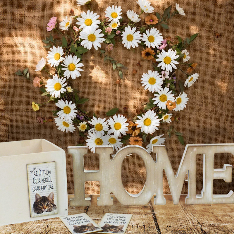 Ez a saját gyártású nyomtatott dekorkarton az „Az otthon cica nélkül” felirat mellett egy aranyos cica grafikával készül, amely tökéletesen illik a cicakedvelők dekorációihoz. Kiváló választás koszorúkhoz, ajtódíszekhez, faldekorációkhoz vagy egyedi kézműves projektekhez, ahol a felirat és az illusztráció együtt adja meg a dekoráció hangulatát. A minőségi nyomtatás letisztult, esztétikus megjelenést biztosít, a 3 darabos kiszerelés pedig többféle felhasználást is lehetővé tesz.
