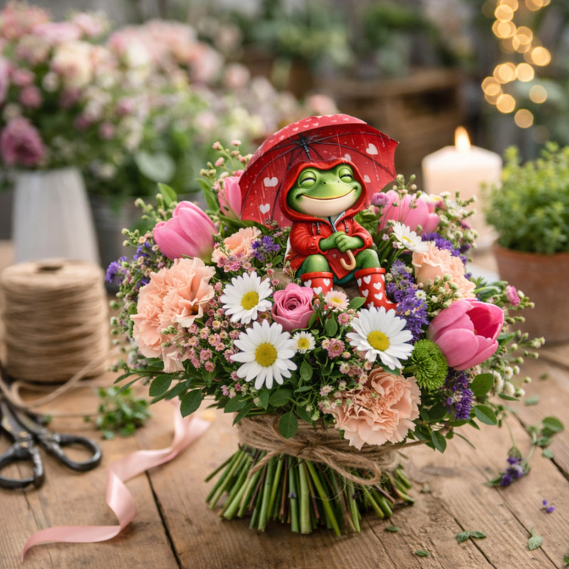 A Nyomtatott dekorkarton - Esernyős béka 2db/csomag saját gyártású, vidám és figyelemfelkeltő dekorációs elem. A mosolygós béka piros esernyővel és szívecskés mintával kedves, szerethető hangulatot teremt, így tökéletes választás ajándékok és meglepetések kiegészítésére.Ideális csokrokba szúrva, ajándékcsomagoláshoz vagy kreatív dekorációkhoz, de önálló díszítőelemként is megállja a helyét. A 2 darabos kiszerelés praktikus megoldást kínál kisebb dekorációkhoz vagy páros ajándékokhoz. Saját gyártású termék, amely egyedi megjelenést ad minden alkotáshoz.
