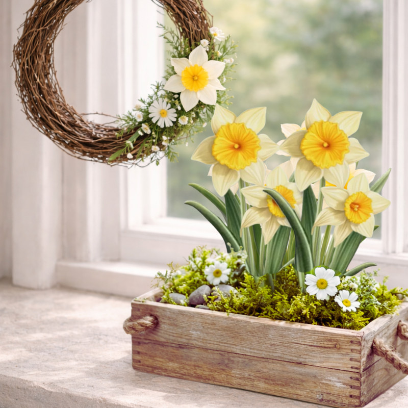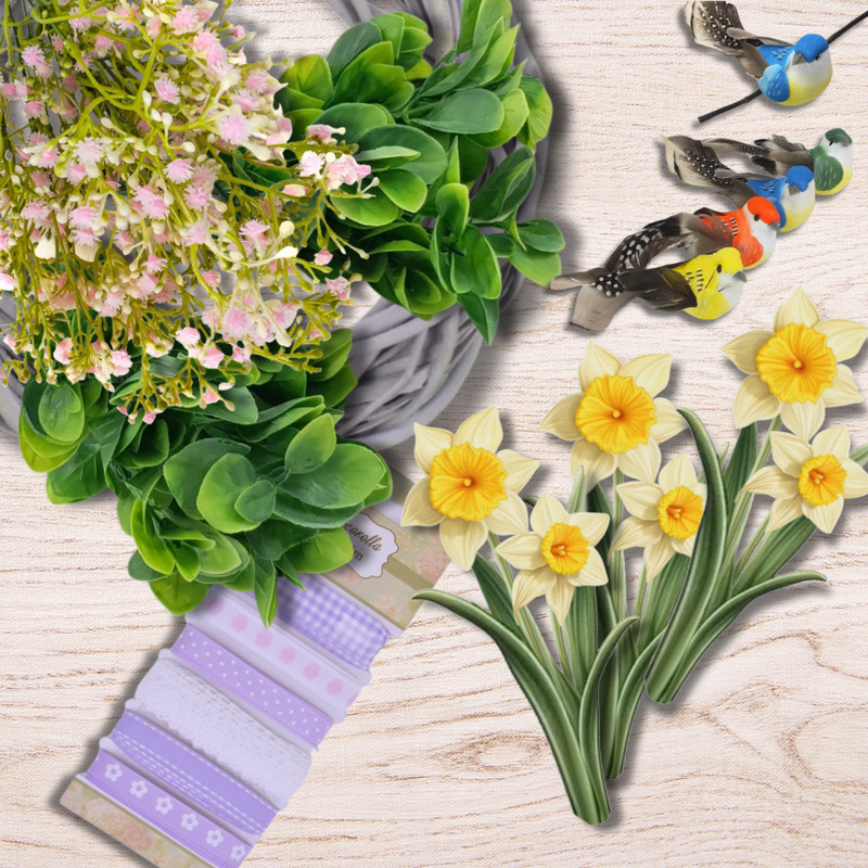 Ez a nyomtatott dekorkarton csomag két darab nárcisz virágot ábrázoló dekorációt tartalmaz. Szép kiegészítője lehet tavaszi és húsvéti koszorúknak, asztali díszeknek vagy egyéb kreatív összeállításoknak. Könnyű anyaga miatt egyszerűen rögzíthető, és jól kombinálható más virágos, természetes hangulatú dekorációs elemekkel.