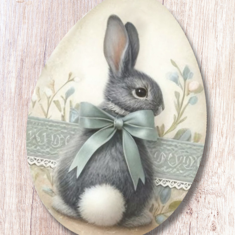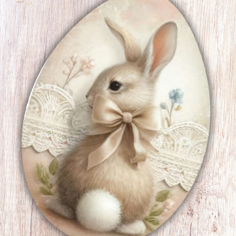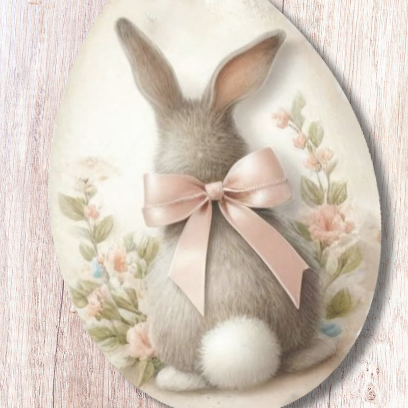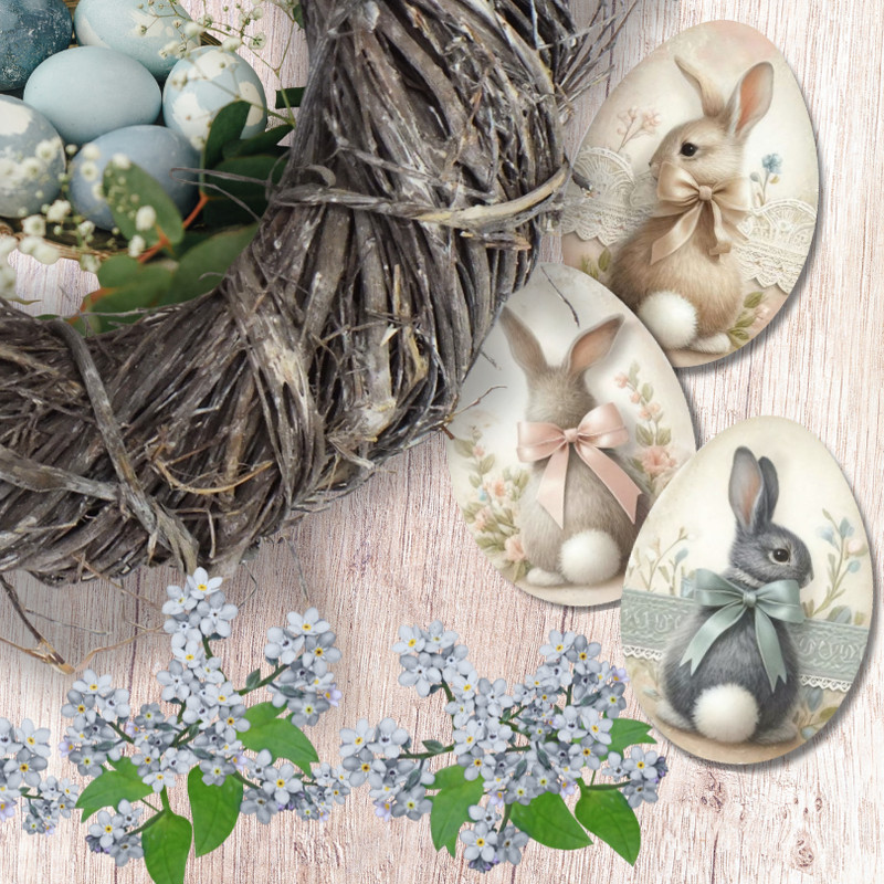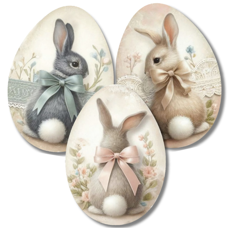 Ez a nyomtatott dekorkarton szett három darab, 6 cm-es nyuszis tojást tartalmaz vintage hangulatú mintával. Saját gyártású termék, amely tökéletes választás húsvéti koszorúkhoz, asztali dekorációkhoz, ajtódíszekhez vagy kreatív alkotásokhoz. Könnyű anyagának köszönhetően egyszerűen rögzíthető, és jól kombinálható természetes, tavaszi dekorációs elemekkel.