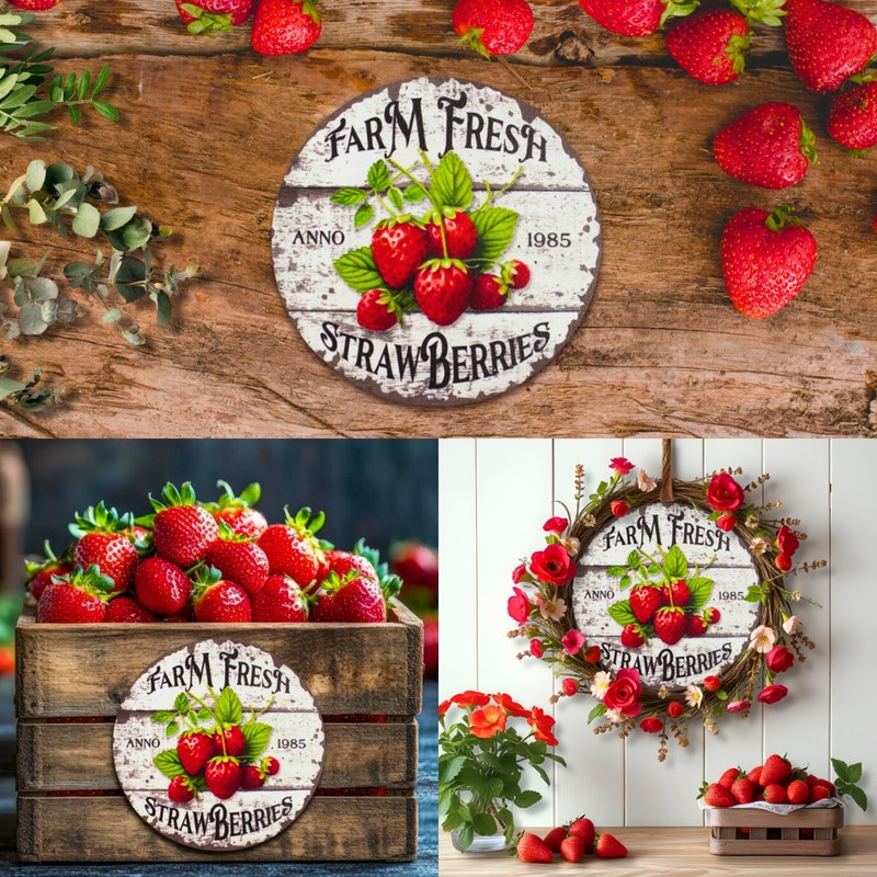 Nyomtatott fa tábla - Eper farm koszorú közép 11,8cm