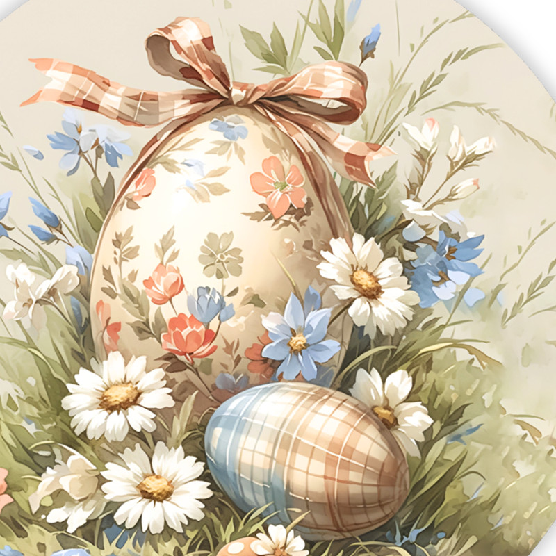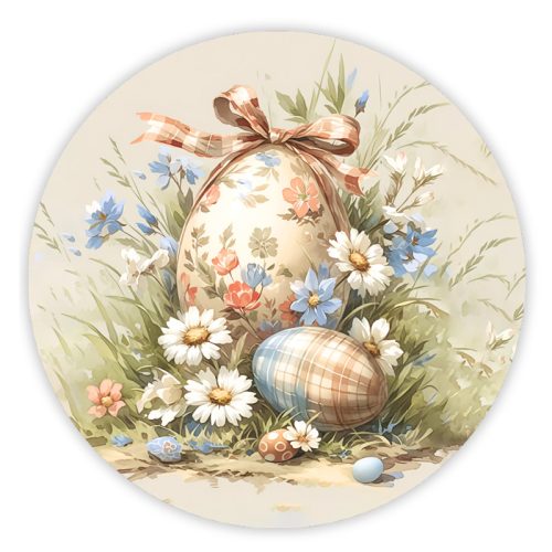 Ez a nyomtatott fa tábla húsvéti pasztell mintáival kifejezetten koszorú középnek készült. 11,8 cm-es méretének köszönhetően harmonikusan illeszkedik húsvéti és tavaszi koszorúkba, de kreatív dekorációs elemeként más ünnepi összeállításokban is jól mutat. Letisztult megjelenése könnyen kombinálható különböző stílusú koszorúalapokkal.