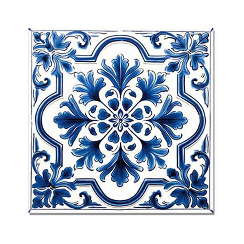 Nyomtatott fa tábla - Mediterrán csempe minta - kék keretes 12,5x12,5cm