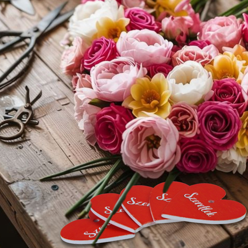 Ez a saját gyártású nyomtatott fa tábla piros szív formájával és szeretlek feliratával érzelmes, mégis letisztult kiegészítő. A 4 cm-es méret diszkrét megjelenést biztosít, így tökéletesen illeszkedik ajándékcsomagokhoz, virágok mellé vagy kisebb dekorációs összeállításokhoz. Az 5 darabos kiszerelés praktikus választás, ha több ajándékot szeretnél egységes stílusban kiegészíteni. A fa alap természetes hatást ad a terméknek, miközben a piros szín és a felirat egyértelműen közvetíti az érzelmi üzenetet.