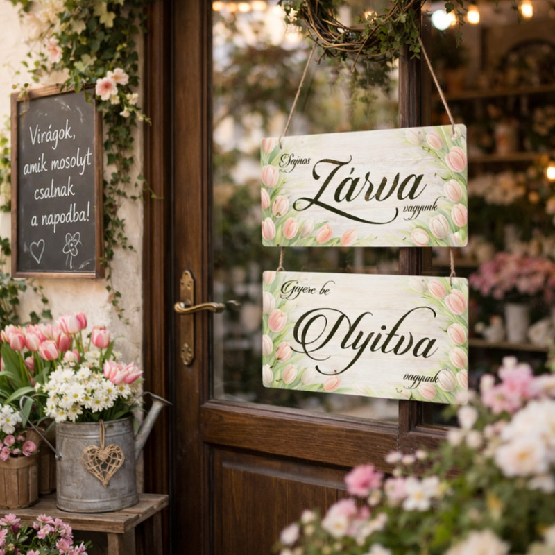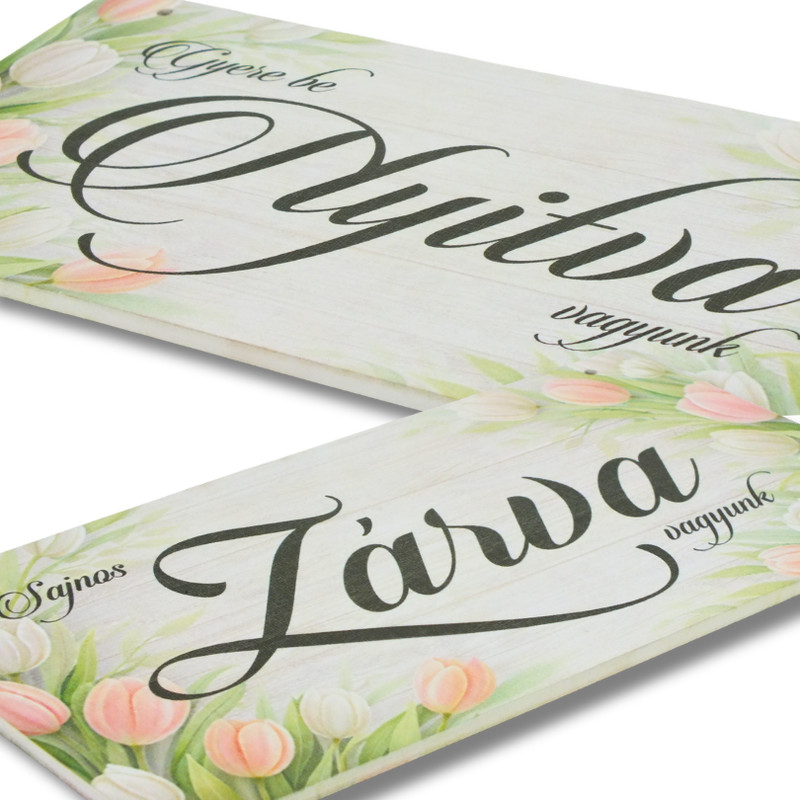Nyomtatott fa tábla - Zárva-Nyitva 24,3x13cm - pasztell tulipános
