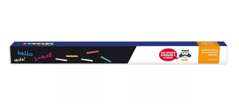 A krétával írható Playbox Öntapadós fekete táblafólia könnyen rögzíthető különböző felületekre, hogy aztán kedvedre írhass, rajzolhass rá. Konyhai tárolók, üvegek feliratozásához is alkalmas. A készlet mindjárt 5 krétát is tartalmaz a mókához, melyből három színes – piros, sárga és kék színű nyomot húz maga után. A teljes tábla mérete 200 x 42 cm.