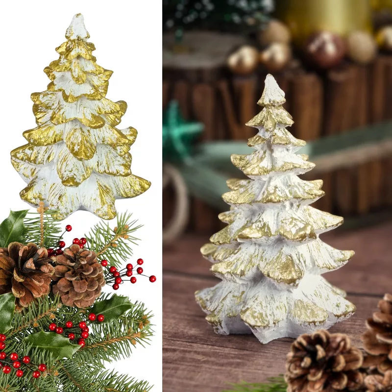 Fehér fenyőfa arany díszítéssel. Dobd fel vele ünnepi dekorációdat.