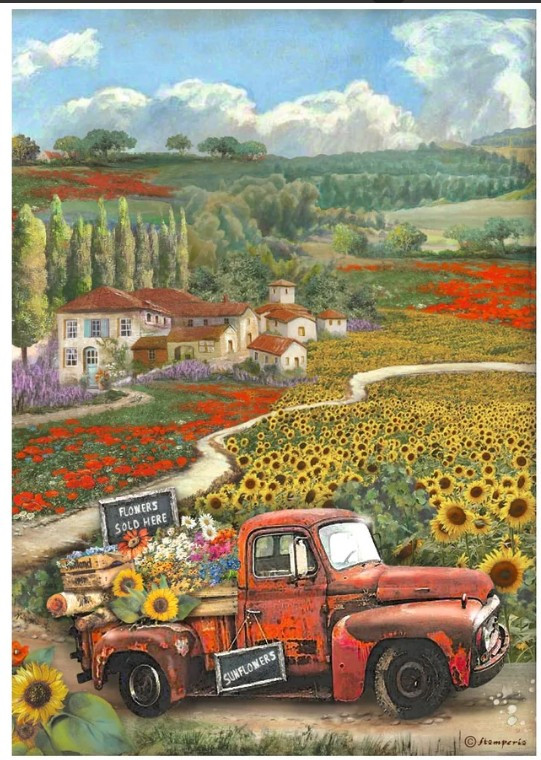 Ez a decoupage rizspapír a vidéki élet egyedi varázsát és egy színes nyári nap meleg hangulatát ragadja meg. Az illusztráció egy idilli tájat ábrázol csendes dombokkal, végtelen napraforgó- és piros pipacsmezőkkel, egy hangulatos mediterrán stílusú parasztházat és egy friss virágokkal megrakott vintage teherautót – egy történettel, nosztalgiával és vizuális örömmel teli kép.