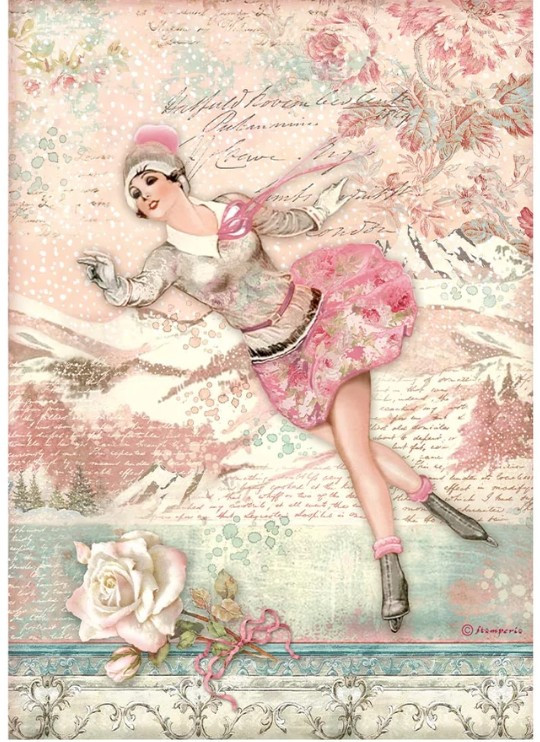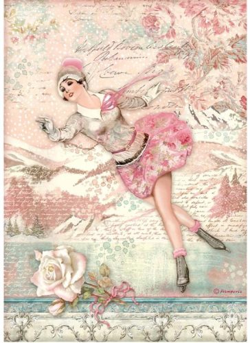Ez az A4-es méretű rizspapír tökéletes kreatív projektekhez, amelyek varázslatot, kecsességet és finomságot közvetítenek. Az illusztráció egy fiatal korcsolyázót ábrázol vintage stílusban, romantikus púderrózsaszín, fehér, krémszínű és diszkrét jegeskék árnyalatokkal. A dekoratív háttér hegyi tájjal, hópelyhekkel és finom virágos elemekkel meseszerű hangulatot teremt, ideális nőies, elegáns és nosztalgikus munkákhoz.