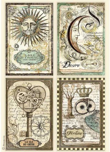 RizspapírA4 - dekupázs technikához - Vintage kollekció „Nap, Hold, Szívkulcs és Szerencsebagoly”