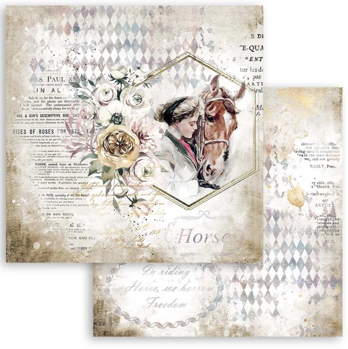 Scrapbook kétoldalas papír – 30,5 x 30,5 cm – vintage dizájn ló és romantikus témával